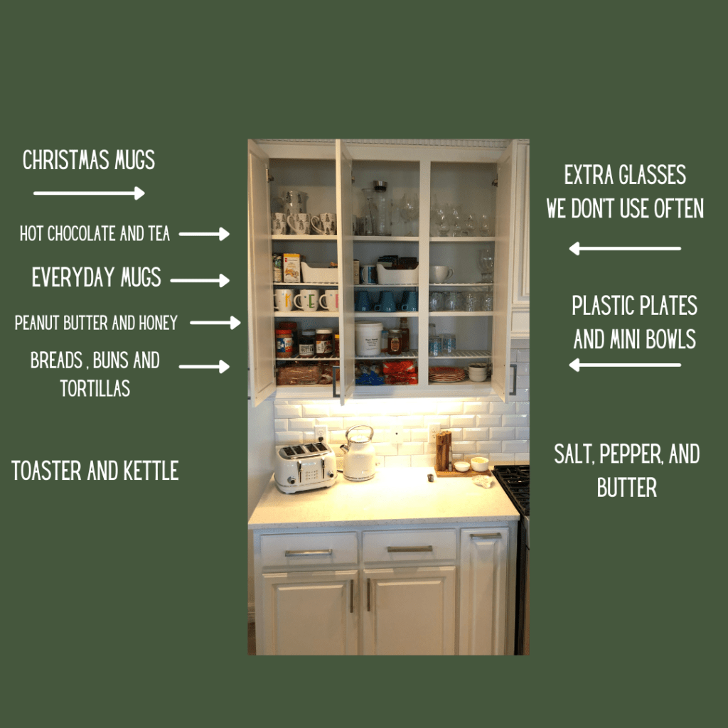 First I want you to put the items on your counters that you want out. You can build zones from there. You may have a coffee making zone, baking zone, breakfast zone, cooking zone etc. Let me show you my kitchen so you can see what I mean by zones.