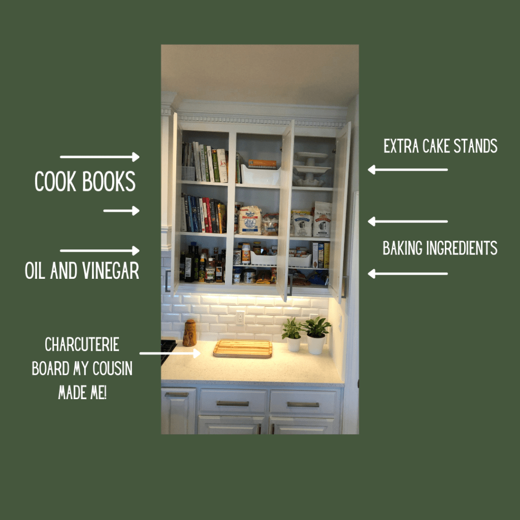 This is my “baking zone”. I used to keep my kitchen aid on the counter but right now I am storing it in the pantry. I tend to make treats way too often when it’s easily accessible on the counter top.