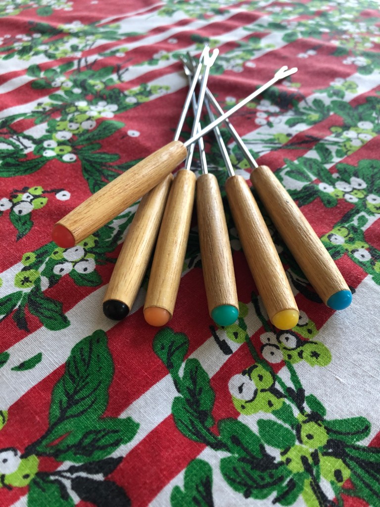 When I was a kid it felt like the prep for fondue took all day. In reality it is an easy prep meal. I think when you’re a kid everything feels like it takes forever when you are anxiously waiting for Christmas morning to come. I would help do anything to speed up the process, we all would. Add the leaves to the dining room table, gather chairs from the kitchen, help set the table and decide what fondue fork each person would get. You see on the end of the fondue fork there is a plastic half circle, all different colors so you wouldn’t confuse your fork with someone else’s. I always wanted the yellow one. Aside from the food for the fondue my mom would always have one of us make a salad and she baked potatoes. We would also have something “fizzy” to drink, as my mom would say.