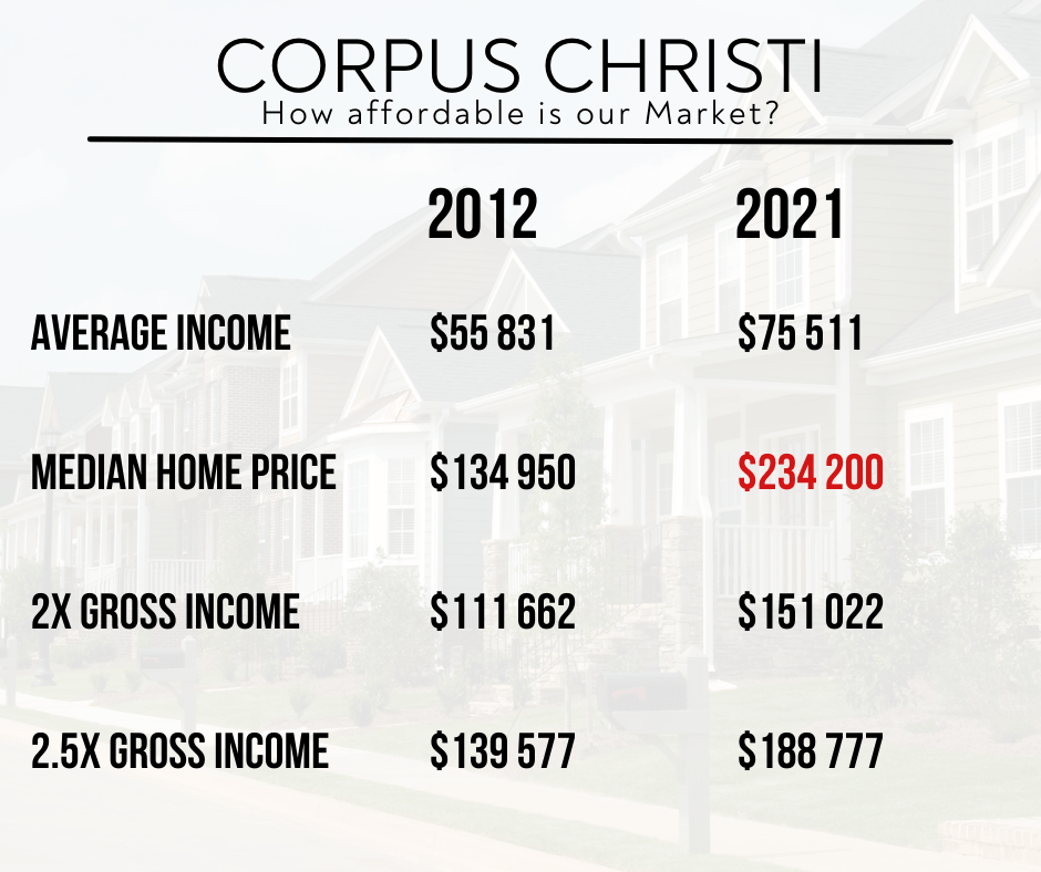 Now let’s talk Numbers. The median price of a home in Corpus Christi in 2012 was $134 950 and just nine years later it is $234 200. That is an increase of almost $100 000. That is a big jump when you consider the average income here in Corpus was $55 831 in 2012 and today it is $75 511.